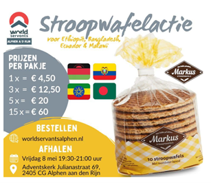 De jongeren die actief deelnemen aan de WorldServants komen, na het stamppottenbuffet, met een volgende actie om geld in te zamelen voor hun hulp in diverse landen. Deze keer gaat het om de stroopwafelactie. Zie de poster hiernaast.Voor degenen die geen kans zien om bestelde stroopwafels op te halen bij de Adventskerk: u kunt uw bestelling ook plaatsen via: